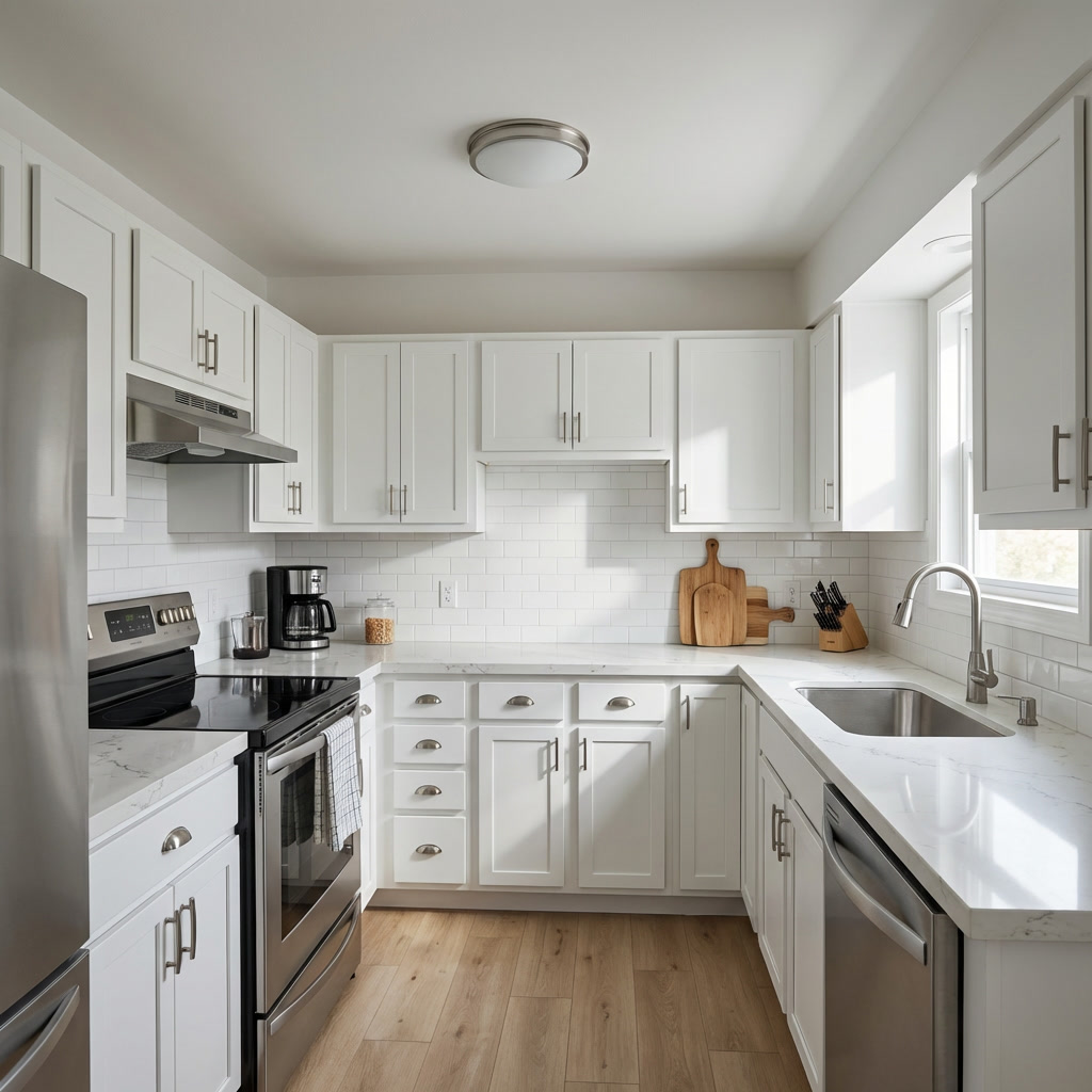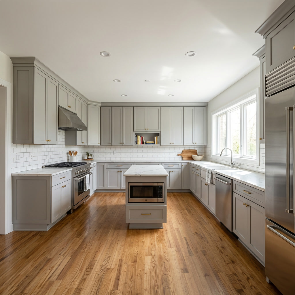 Explore our latest kitchen remodel project featuring new hardwood flooring, custom cabinetry, and modern appliances for a refreshed look.