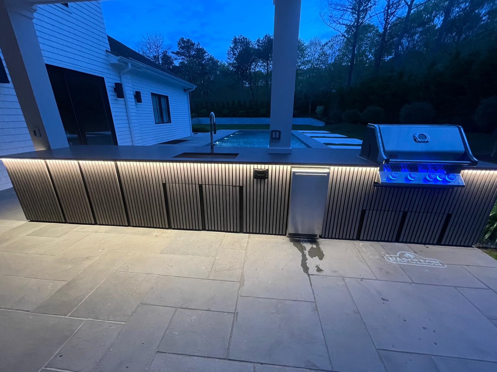 Modern outdoor kitchen upgrade in Long Island featuring custom slat panels, integrated LED lighting, and premium outdoor appliances installed by V21…