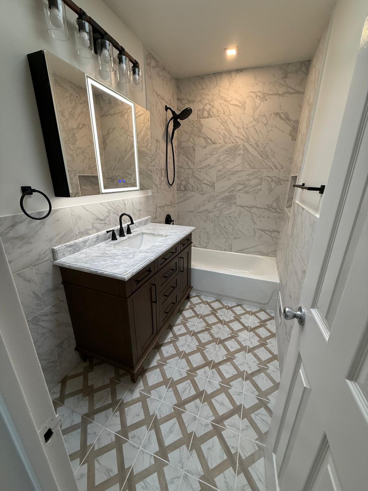 Modern Queens bathroom renovation featuring marble-look porcelain tile, patterned flooring, matte-black fixtures, and full plumbing/electrical…