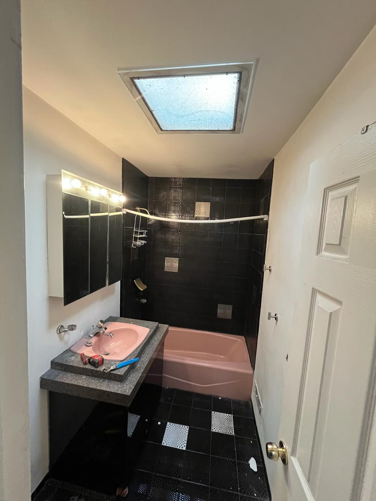 V21 Construction completed a full bathroom renovation transforming an outdated pink-and-black Bronx bathroom into a bright, modern, and functional space. The scope included demolition, new plumbing fixtures, updated lighting, porcelain plank flooring, subway tile tub surround, moisture-resistant paint, a navy vanity with quartz countertop, and upgraded ventilation for long-term performance.