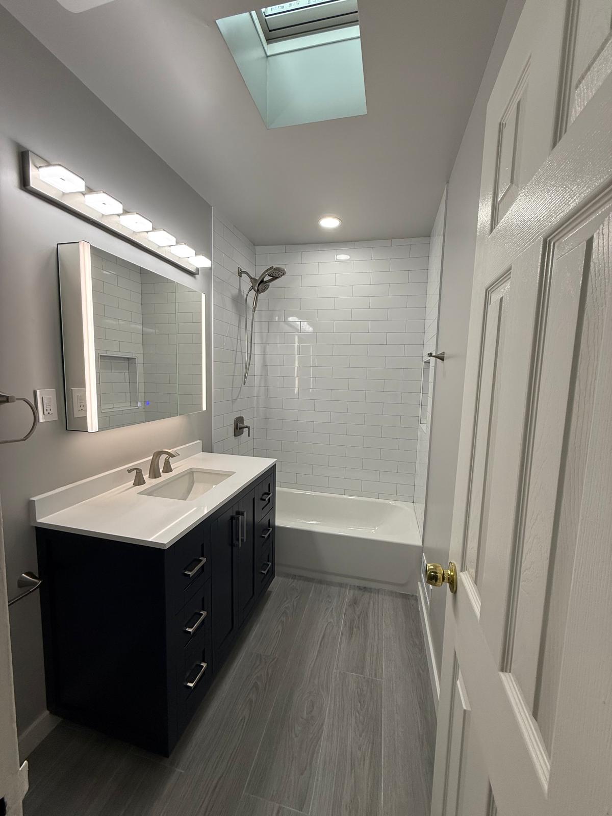 - White subway tile tub and shower surround with custom niche - LED backlit mirror and upgraded vanity lighting - Navy shaker vanity with quartz countertop - Gray porcelain plank flooring for durability - Improved ventilation with a new exhaust fan - Updated plumbing and electrical for code compliance - Full transformation from outdated to contemporary