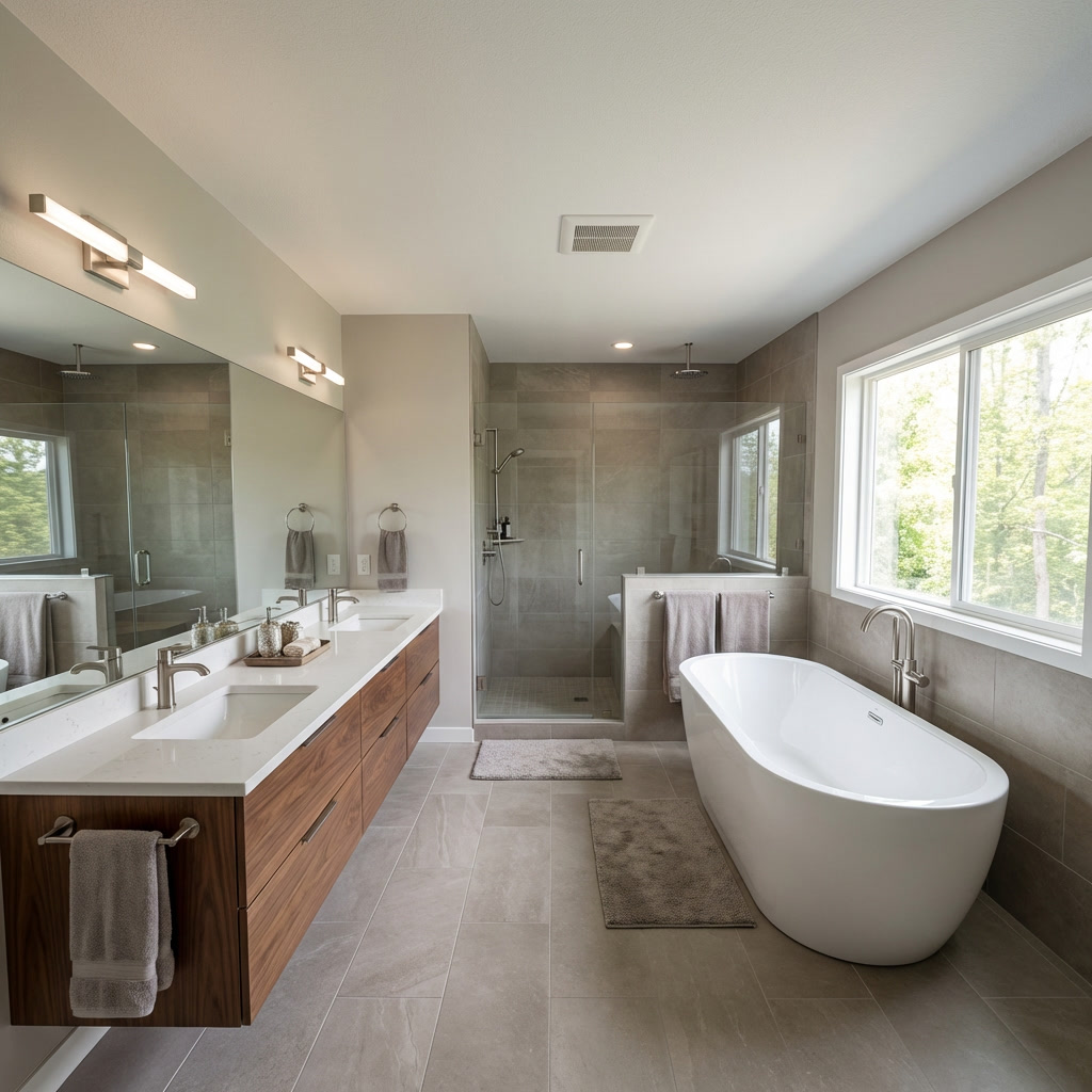 Freestanding bathtub Double sink vanity Large glass-enclosed shower