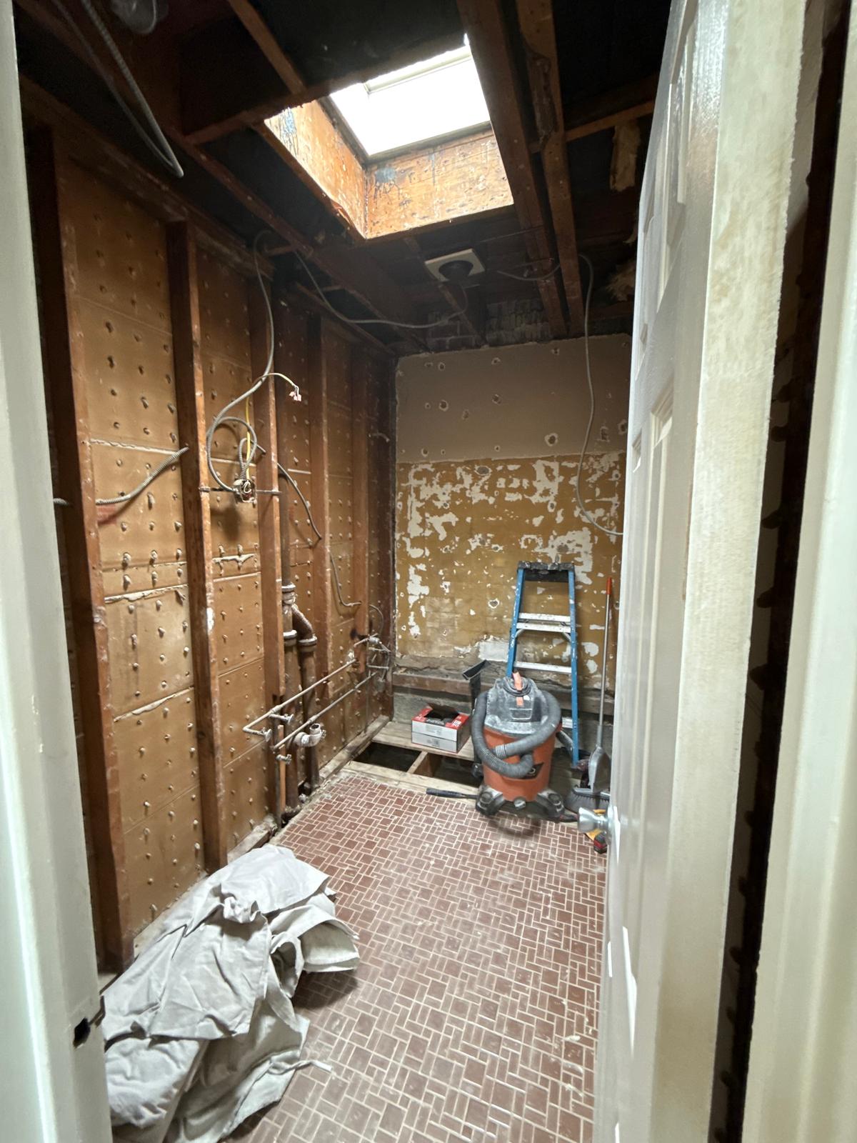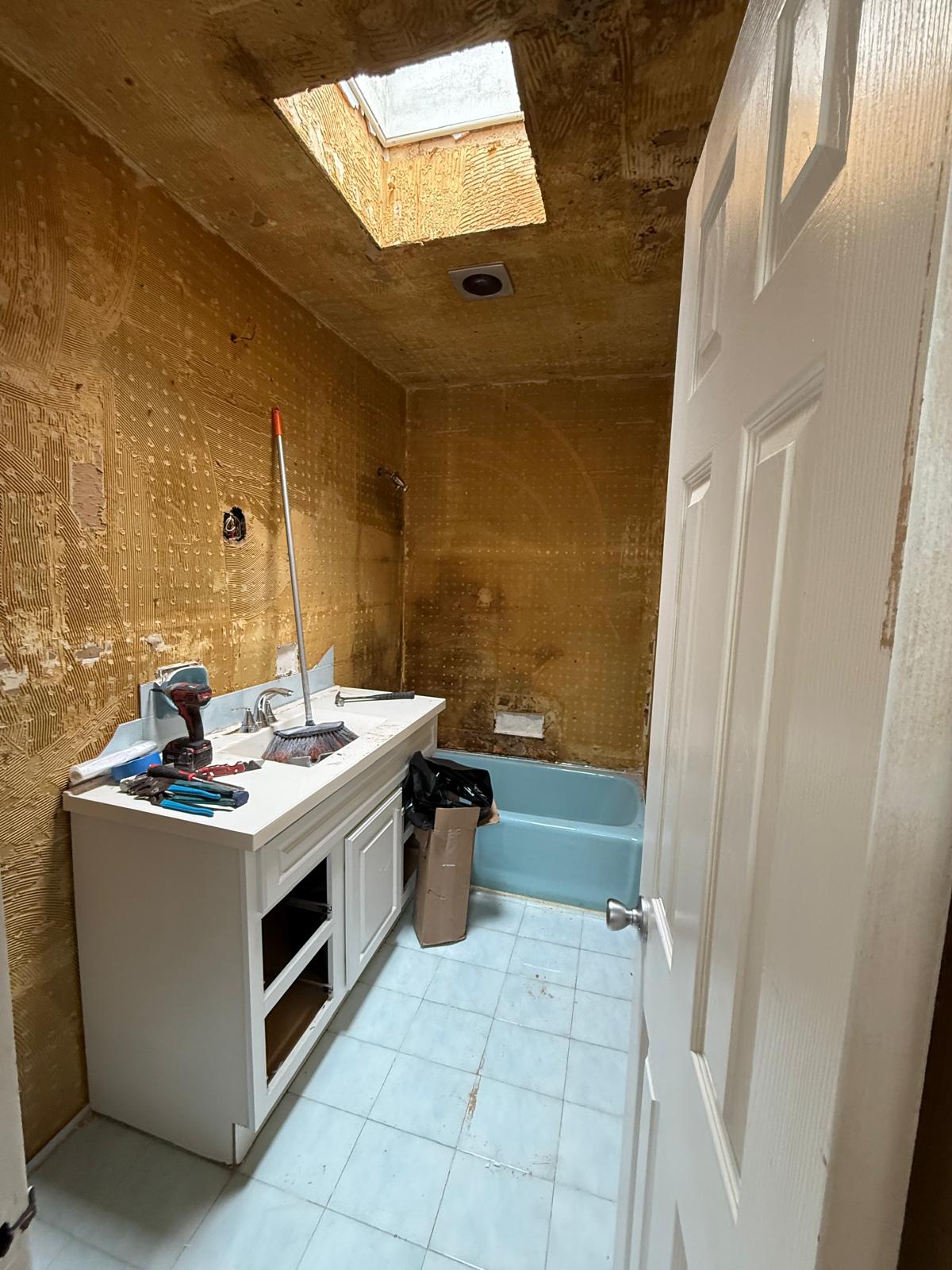 The original bathroom showed signs of aging tile, water exposure behind wallboard, outdated plumbing, and poor ventilation around the skylight. Our team removed all existing finishes down to the studs, replaced compromised substrate, corrected plumbing height and alignment, and installed a moisture-resistant tile backer system. The design focus was clean lines, bright surfaces, patterned flooring for visual interest, and high durability across all materials.