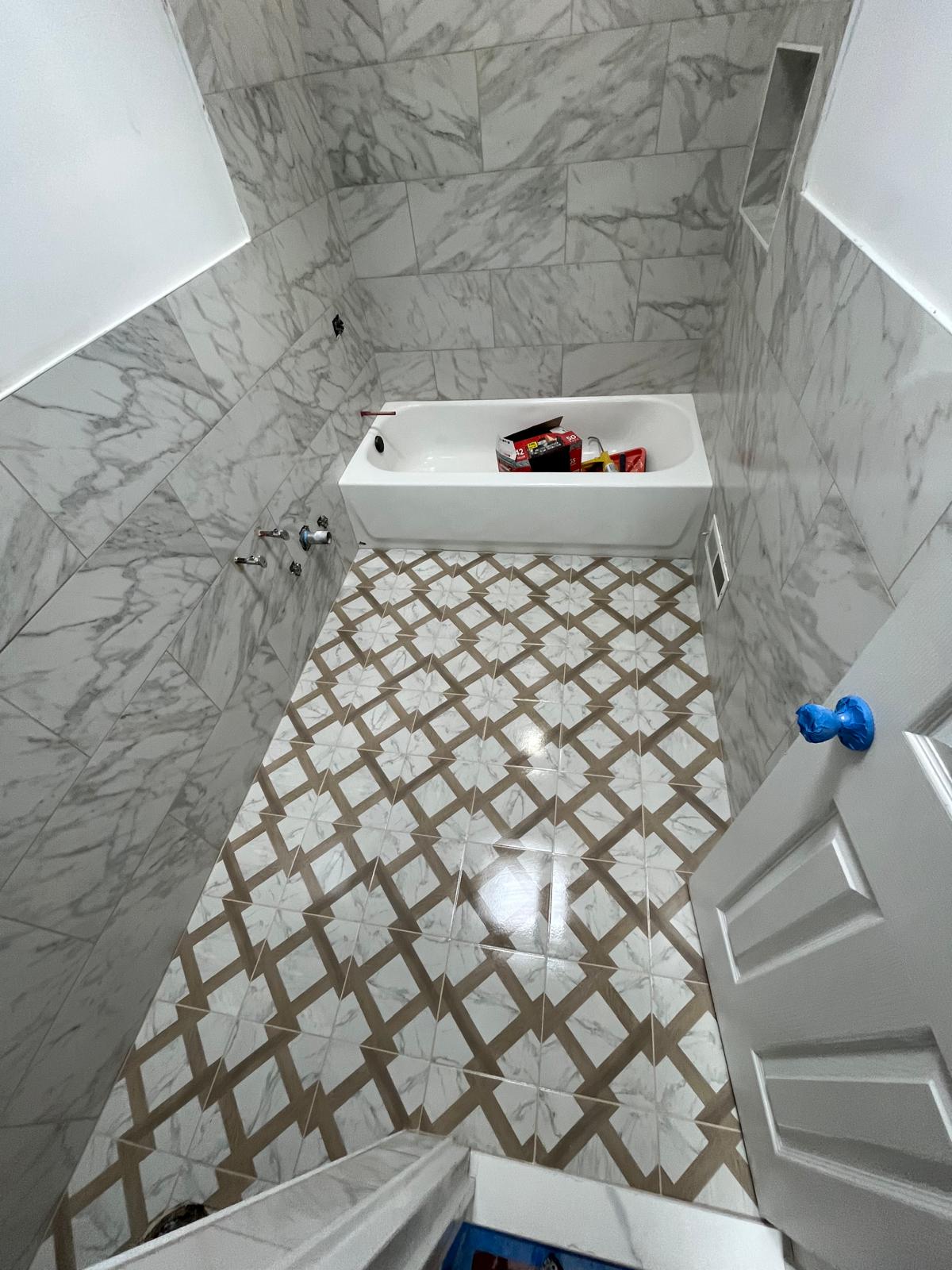 - Full demolition to studs; removal of outdated plumbing and electrical - Install of cement board and waterproofing membrane around wet areas - Precision tile layout for walls and patterned floor symmetry - Plumbing height corrections and installation of modern shutoff valves - Electrical updates for vanity LED, recessed lighting, and exhaust fan - Vanity install with level scribe and secured marble-look countertop - Matte-black shower trim installation with proper pressure testing - Grout sealing and final waterproof inspection