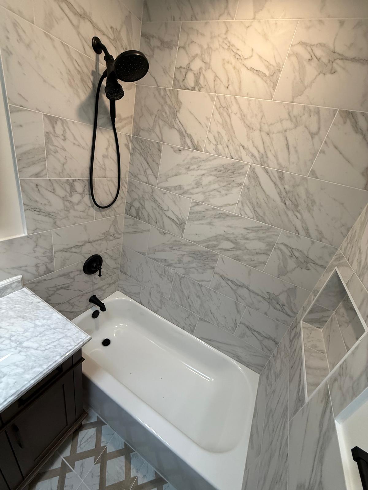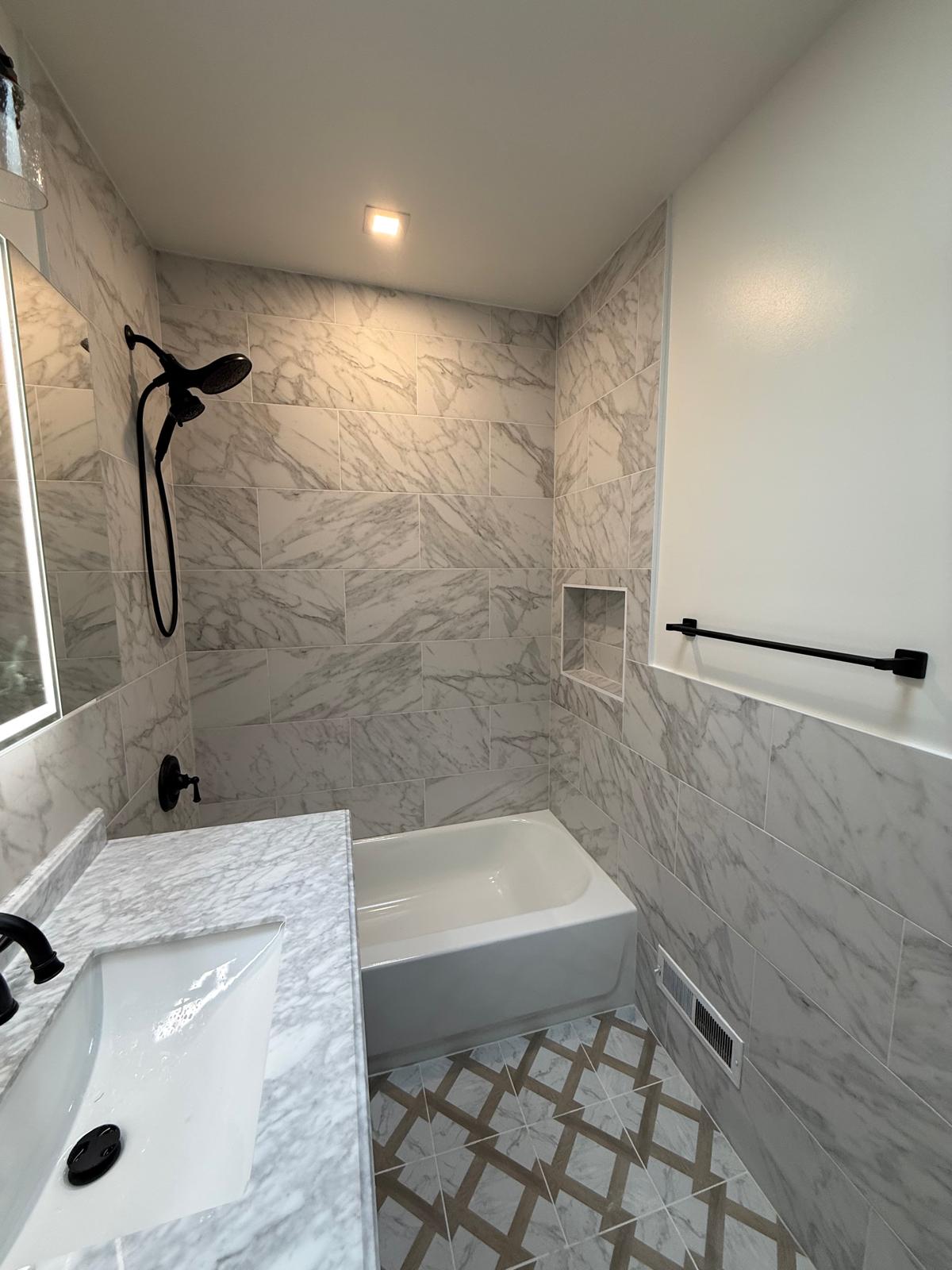 - Full gut renovation with upgraded plumbing and electrical - Marble-look wall tile with seamless niche detailing - Geometric patterned porcelain floor for elevated design - Matte-black fixtures and accessories for modern contrast - LED vanity lighting and recessed ceiling light for balanced illumination - Moisture-protected wall systems and high-efficiency exhaust fan