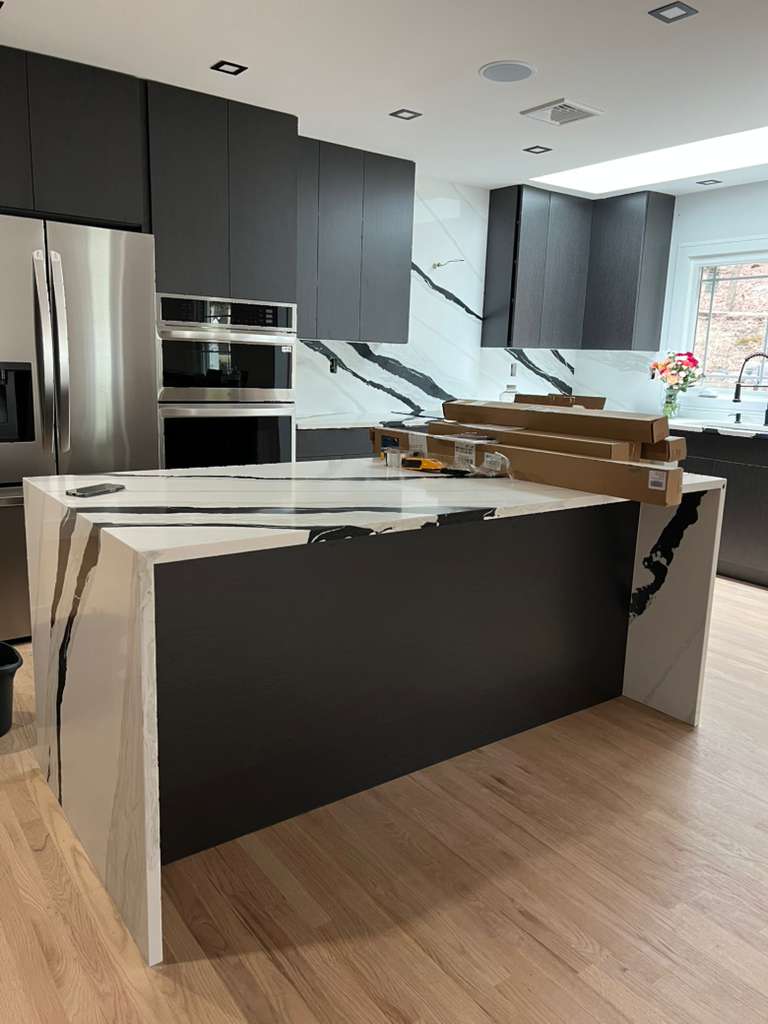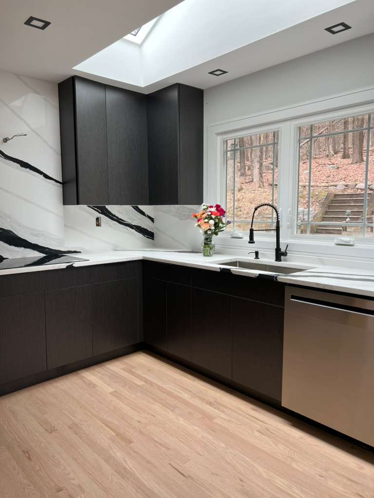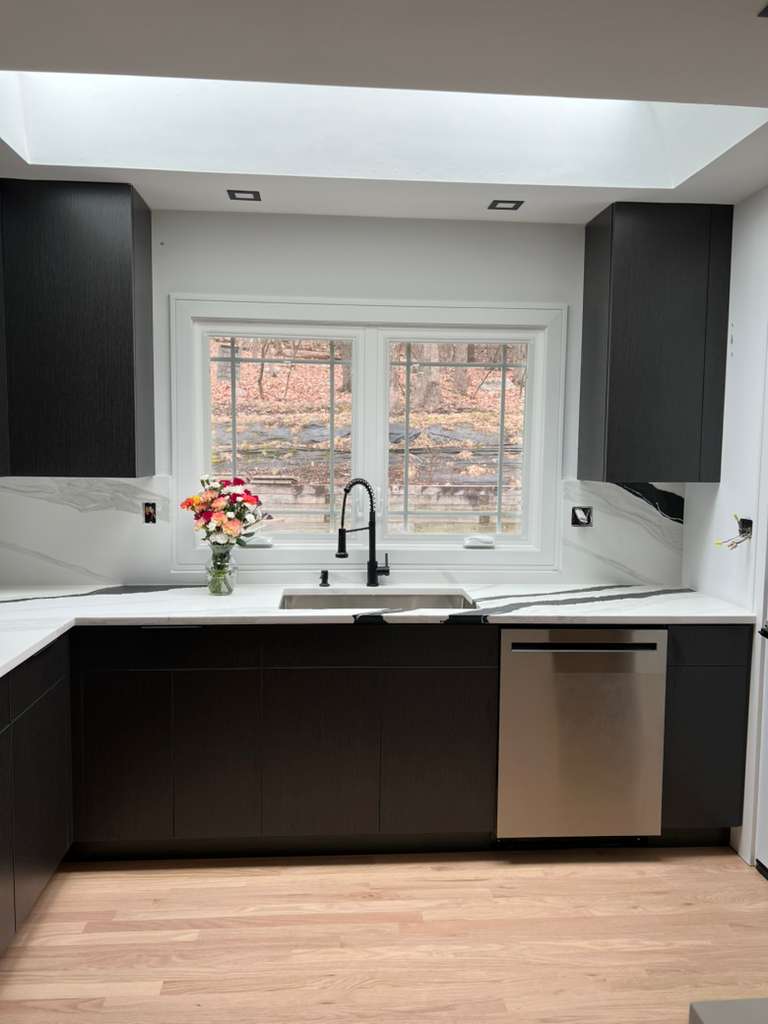 Removal of old cabinetry and countertops Installation of new cabinetry Installation of marble countertops Plumbing and electrical adjustments Final touches and cleanup