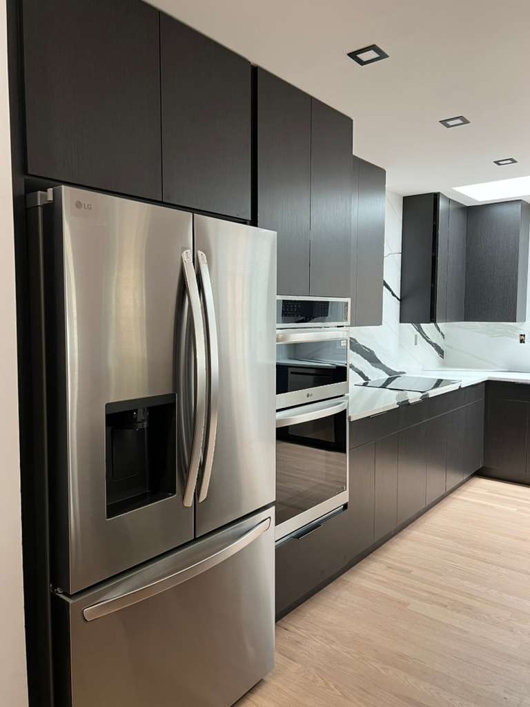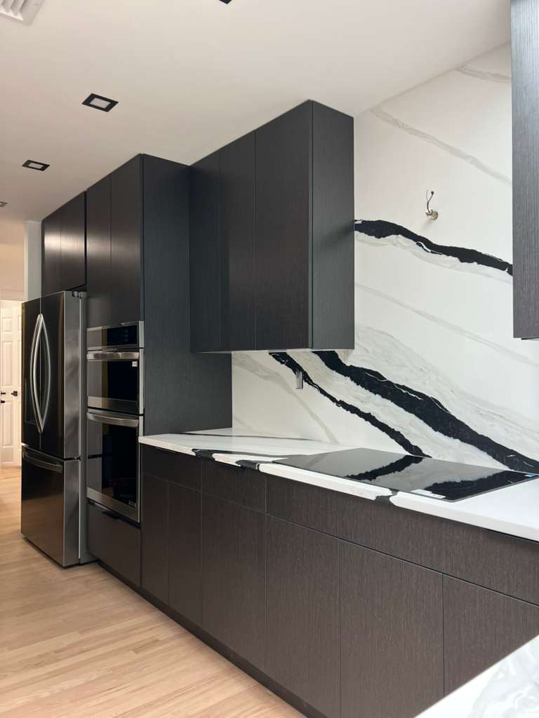 The kitchen showcases a contemporary design with dark cabinetry and striking marble countertops. The layout is functional with ample storage and modern appliances.