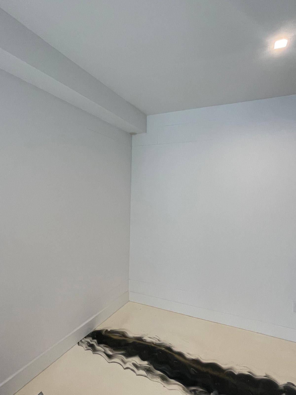- Slat Panels: Vertical black acoustic-style MDF slats - Framing: Pine 1x2 and 1x3 structural grid for panel support - LED Lighting: Perimeter LED strip lighting with concealed aluminum channels - Surface Finishes: High-hide matte white wall paint - Electrical: Low-voltage LED driver and hidden wiring pathway - Trim: Minimalist white baseboards for clean floor transitions - Flooring: High-gloss epoxy floor with abstract black resin pattern