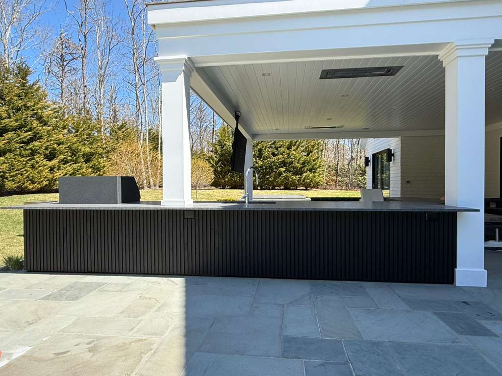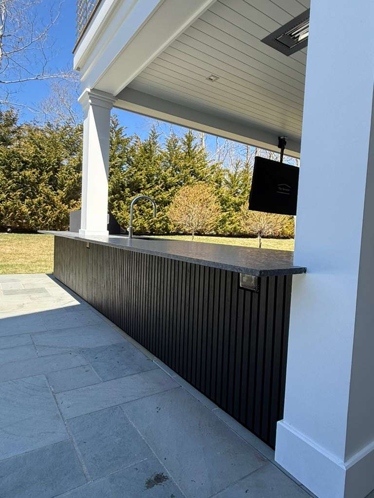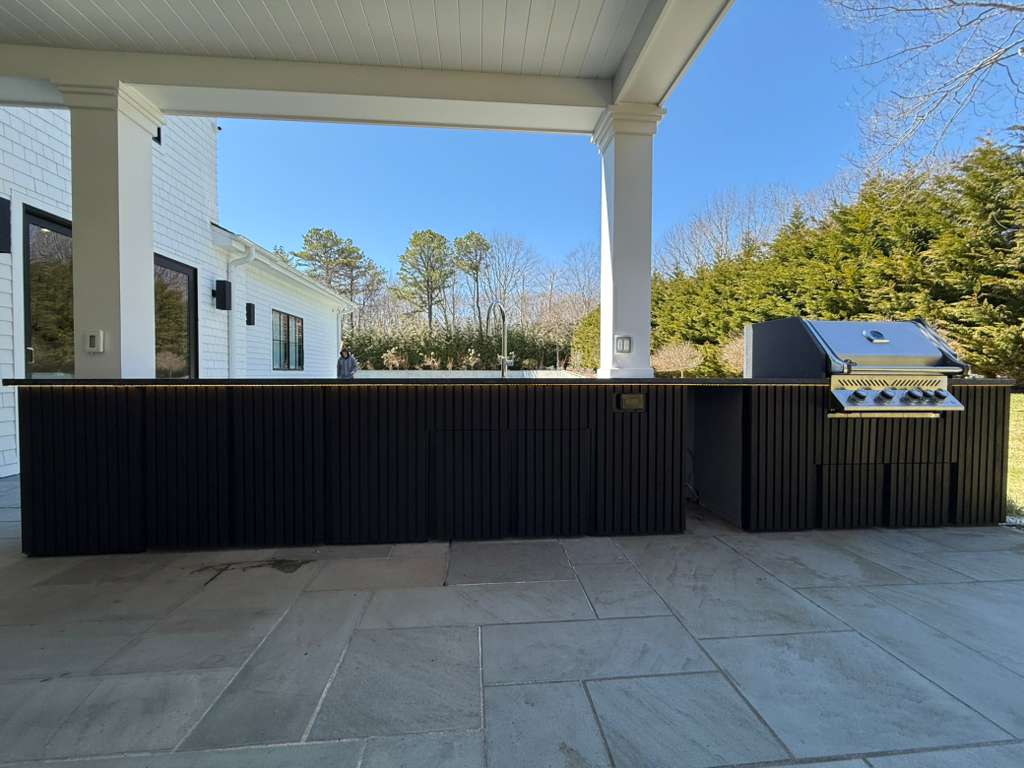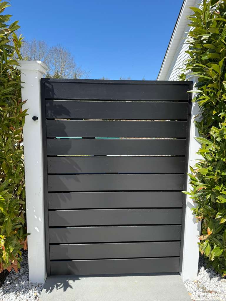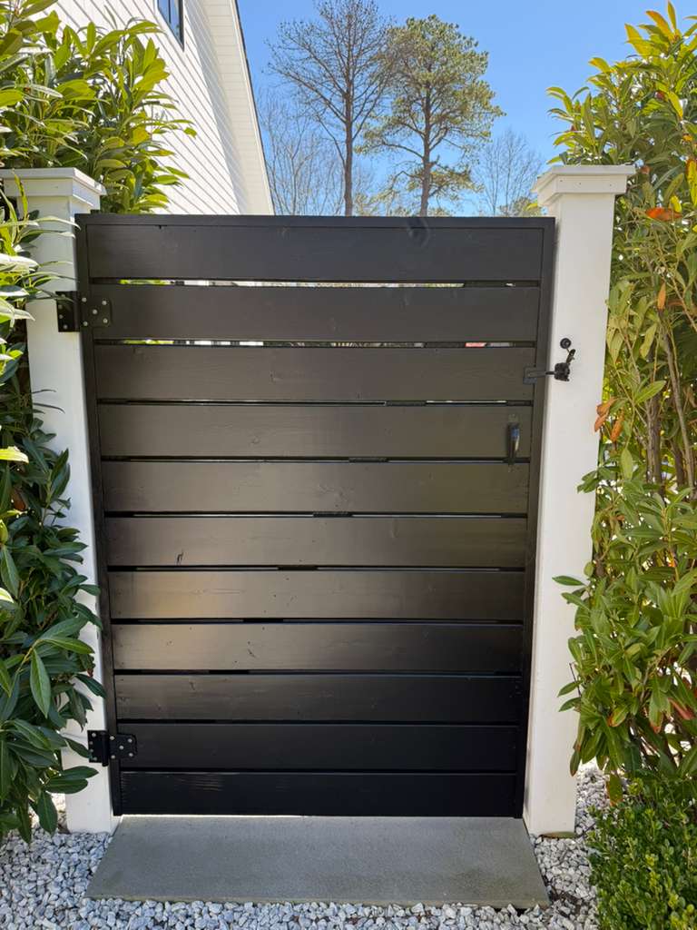 The project involved painting various outdoor and indoor structures, including gates, an outdoor kitchen, and a fireplace.