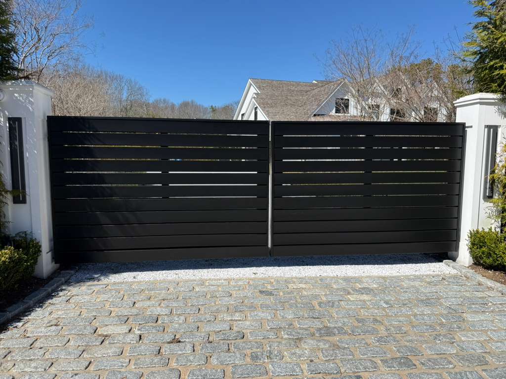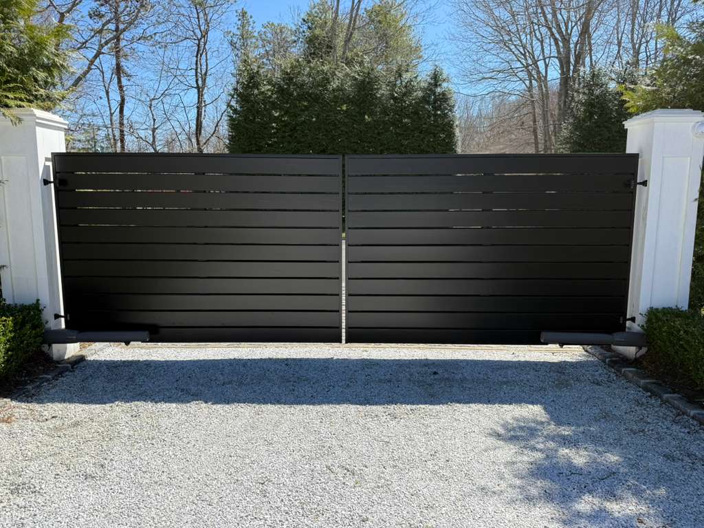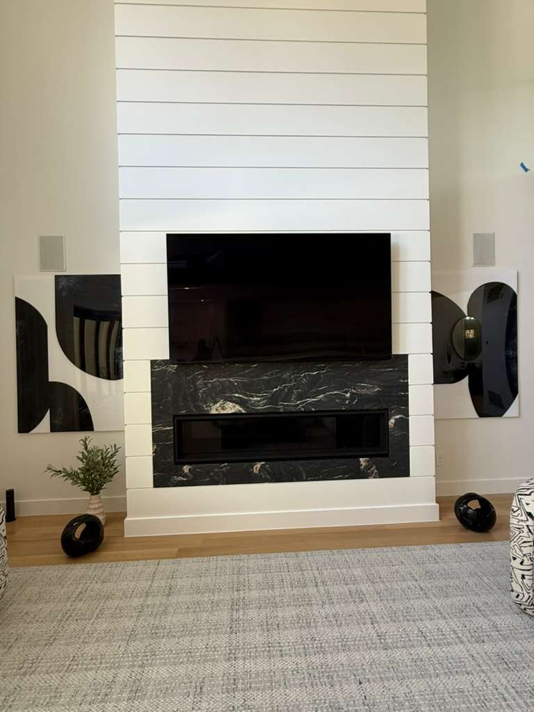 Sleek black finish on gates Crisp white finish on fireplace